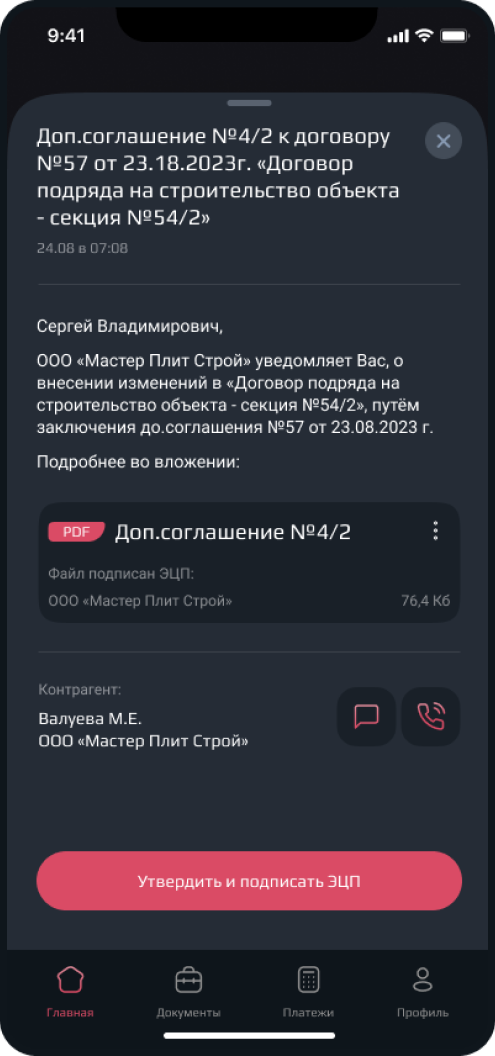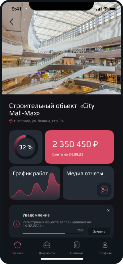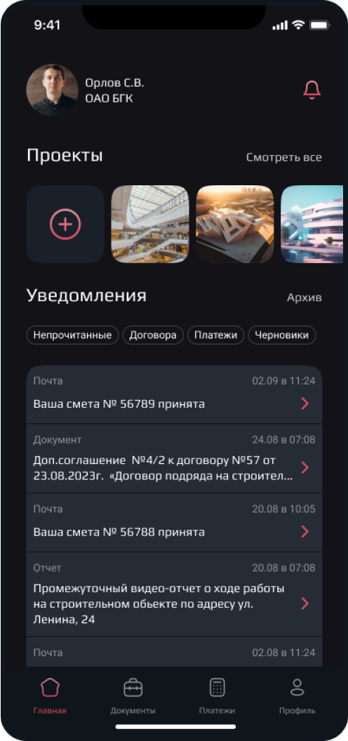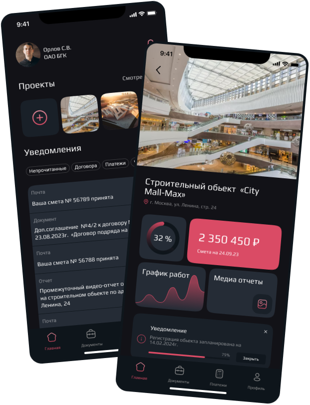 Приложение для строительной компании "Авангард", где заказчик и исполнитель могут общаться, подписывать договор через ЭЦП, составлять сметы и быть уверенным в честной сделке, так как наша компания выступает гарантом между двух сторон с помощью прописанных смарт-контрактов. Отслеживать сумму, потраченную на строительство, количество затраченных материалов, этапы, бригаду рабочих. Также приложение позволяет заливать фото и видео материалы для оценки работ, а также созваниваться с заказчиком или исполнителем.