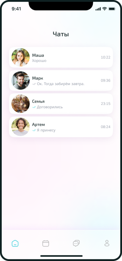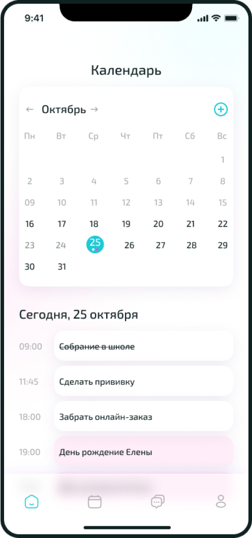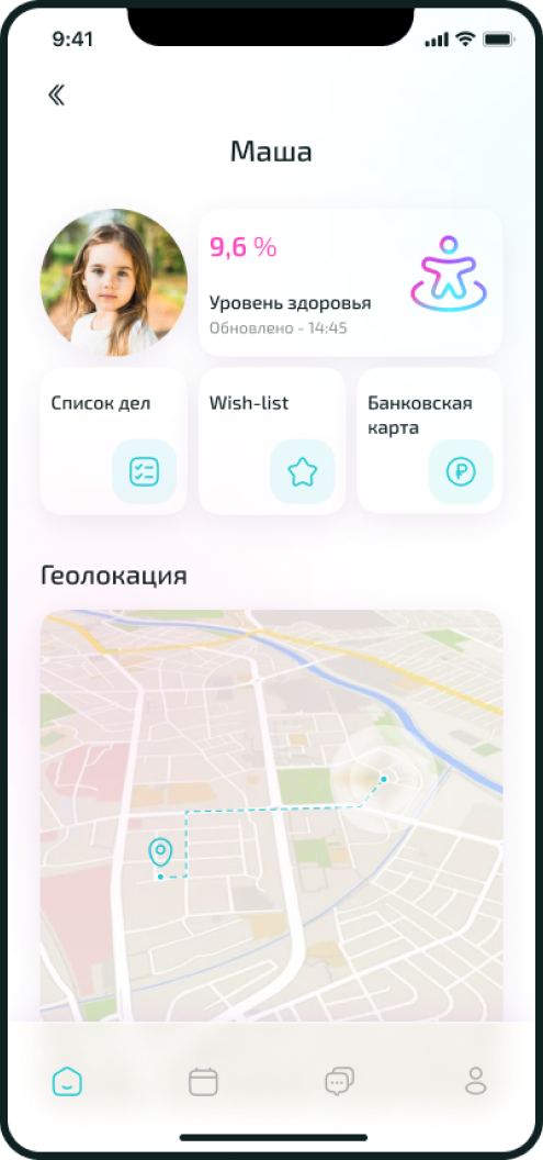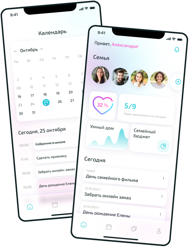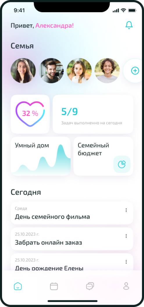 Приложение для членов семьи, которое позволяет отслеживать дела по хозяйству, семейный бюджет, геолокацию детей, задачи для каждого члена семьи,профильные или семейные праздники, а также имеет семейный чат и отдельные. Позволяет пополнять или оплачивать определенные выставленные счета. Wish-листы для каждого с возможностью бронирования подарка или совместной покупкой. Совместимость с умными часами, которая показывает уровень здоровья и активности. Специальная система отслеживания уровня комфорта и любви в семье для каждого человека.